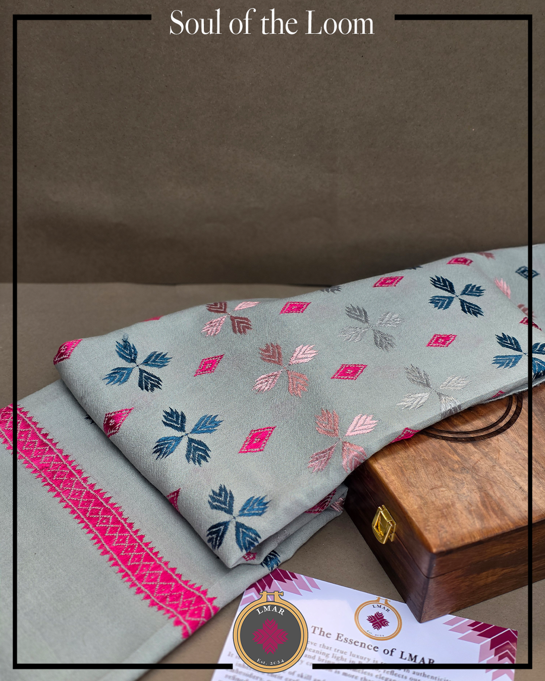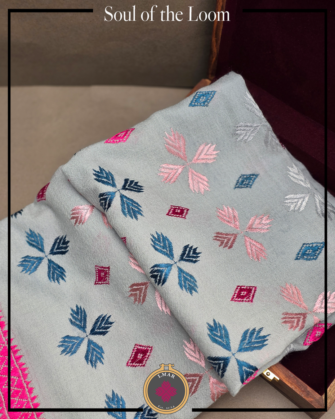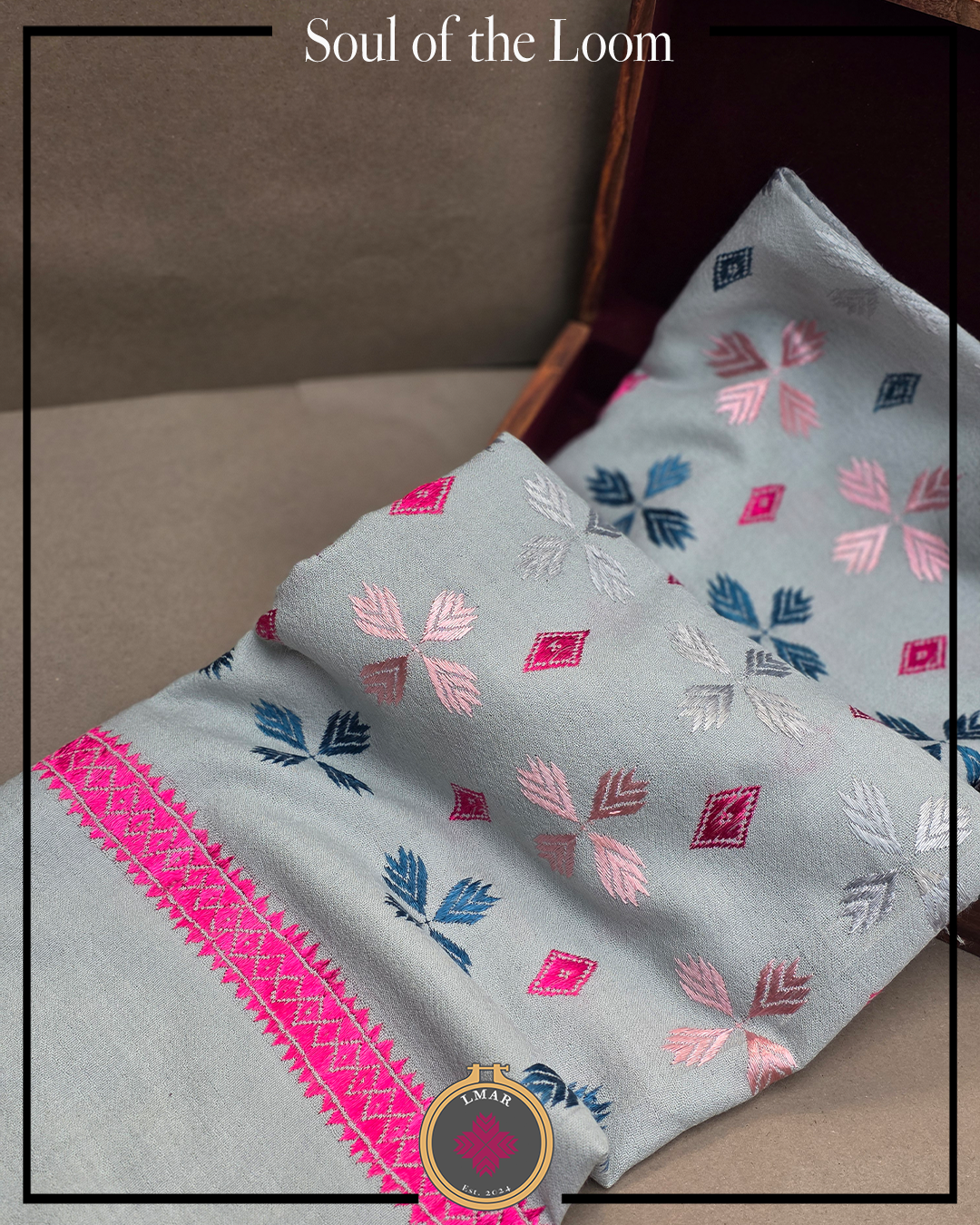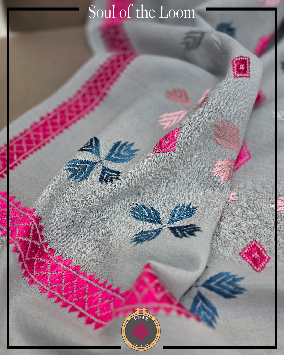 Colour: Cool Grey Base with Multicolor Embroidery and Pink Border